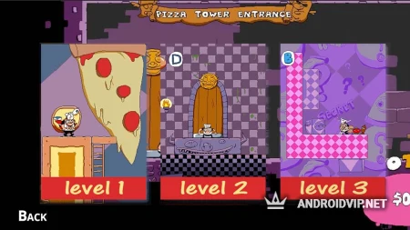 Башня Пиццы состоит из 5 этажей. Каждый этаж содержит 4 уровня и главного босса. Но на последнем этаже вас ждут три уровня. На каждом из уровней спрятаны секретные помещения и различные сокровища.