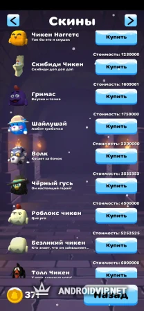 Количество и разнообразие скинов порадует всех любителей аркад. Например, есть любимый многими Скибиди Чикен, Гримас, Шайлушай, Волк, Черный гусь и многие другие не менее забавные персонажи. К сожалению, отличаются они только внешним видом и не дают никакого преимущества для заработка монет.