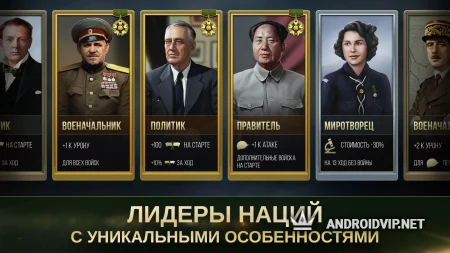В целом в игре есть сотни уникальных миссий, где исход событий зависит от вас, примите ли вы решение напасть, захватить территорию, или же заключить перемирие. Все страны разделены на небольшие участки, от чего бои будут гораздо продолжительнее. Разнообразия придаёт возможность выбирать лидеров, а также каждая страна имеет уникальные скилы.