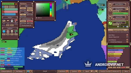 Вы сможете создавать неограниченные сценарии событий, сталкивать целые континенты между собой и устраивать ожесточенные противостояния по всему земному шару. Нации могут быть созданы как вручную, так и с помощью искусственного интеллекта. Интересно, что государства пытаются самостоятельно контролировать подручные им территории, тренируют войско и расширяют границы. Они также могут заключать союзы, производить политические перевороты и восстания.