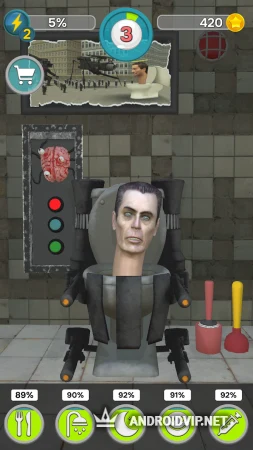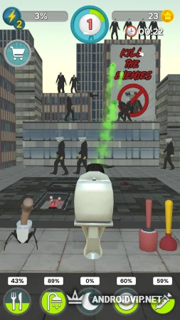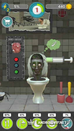 Туалетный монстр постепенно будет увеличиваться в размерах, он станет сильнее, а это значит, что вас ждут сражения с агентами. Камерамены и другие люди в черном будут противостоять вам, используйте все доступные способности и сокрушайте врагов. Заработанные деньги пойдут на покупку оружия, еды и открытие новых туалетных монстров.