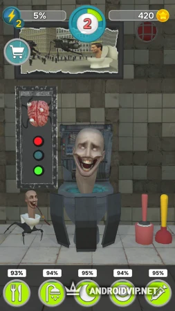 В качестве виртуального питомца, за которым нужно ухаживать выступает Скибиди туалетный монстр. Доступно пять основных показателей, которые необходимо восполнять в течение всего игрового процесса. Питомец любит кушать, причем еда у него достаточно специфичная, он так же, как и все хочет быть чистым, веселым, здоровым и крепко спать. Обращайте внимание на каждый пункт и своевременно восполняйте показатели.