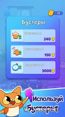 Также есть возможность приобрести бустеры, которые ускорят скорость работы, приумножать количество кликов и многое другое. По мере конечно же будет увеличиваться сложность, но и вознаграждения тоже будут соответствующими. А красочная графика в мультяшном стиле с приятной озвучкой сделают игровой процесс ещё увлекательнее!