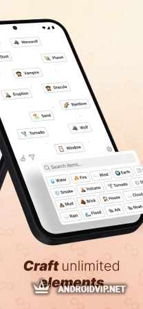 Новые элементы автоматически появляются на игровом поле и добавляются в общий список совершенных открытий. Для удобства элементы можно отсортировать по: времени их открытия, имени и эмодзи. Также в игре есть поле поиска для быстрого нахождения нужного вам элемента. В игре очень много элементов и они не останавливаются на природных явлениях. Здесь есть люди, мифические существа, магия, невероятные постройки и многое другое. Не бойтесь экспериментировать и попробуйте найти все доступные комбинации.