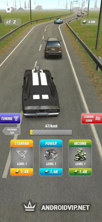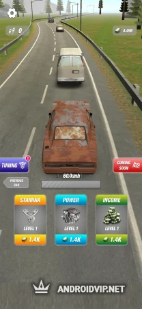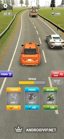 Всего доступно 7 уникальных автомобилей, которые открываются постепенно и меняют не только сложность, но и количество деталей. Все запчасти нужно прокачивать и изменять. Машина будет самостоятельно передвигаться по дорогам общего пользования. Но, чтобы заработать игровую валюту, необходимо удерживать палец на дисплее. Делать это нужно периодически, так как заканчивается выносливость и приходится ждать ее восполнения для совершения обгонов других автомобилей.