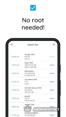 Приложение позволяет быстро сменить DNS-адрес устройства, обеспечивая высокую скорость соединения. По словам разработчиков, данное приложение обеспечивает большую надежность и скорость соединения, нежели обычный VPN. С помощью программы вы сможете посещать любимые сайты, сохранять безопасность при подключении к общедоступным Wi-Fi сетям и получать максимальную скорость при посещении самых разных Интернет-ресурсов.