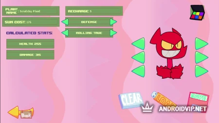 Доступно несколько типов растений для редактирования: стрелки, растения, которые генерируют энергию (солнце), защитники и катапульты. В зависимости от выбранного класса меняется определенный набор характеристик. Каждый из параметров можно менять и настраивать по своему усмотрению. Самое главное – не забудьте сохранить полученный результат, иначе вы не сможете протестировать свои растения в бою.