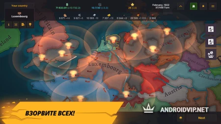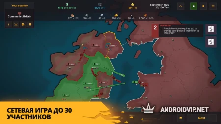 Война войной, а торговые отношения никто не отменял. Даже в кровопролитные времена вы можете обогатить свои карманы при помощи торговли, влиять на стоимость сырья и даже вводить экономические санкции. Военная составляющая игры выполнена на высшем уровне. Можно использовать как обычную пехоту, так и применять ядерное вооружение. Битвы проходят не только на суше, но и в воздухе, а также в море, где под контролем игроков окажутся крейсеры, авианосцы и линкоры. Защищайте интересы своей страны, атакуйте врагов и выбирайте собственный политический курс.