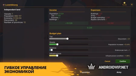 Вы можете стать искусным правителем и умело манипулировать главами государств, начинать или прекращать войны, заключать союзы и разрушать альянсы. Возможности практически безграничны, а ваши союзники должны получать безоговорочную военную помощь, что позволит наказывать недругов и завоевывать новые территории.