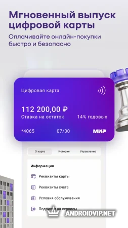 Приложение предлагает современный и продвинутый интерфейс, высокую скорость работы и огромный список возможностей. Если вам потребуются дополнительные средства на покупку бытовой техники, автомобиля, мебели и прочего, то можно оформить кредит без посещения офиса банка. Платить за интернет, телевидение и мобильную связь также очень просто – достаточно воспользоваться функцией автоматического платежа.