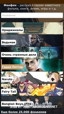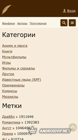 Программа получила удобный и легкий интерфейс, благодаря чему, находить и читать интересные фанфики стало намного проще. Кроме того, вы сможете публиковать собственные рассказы и общаться с другими пользователями и авторами книжного братства. Поиск по приложению осуществляется как привычным образом, так и по выбранным ранее фильтрам: категории, фэндомы, теги и рейтингу.