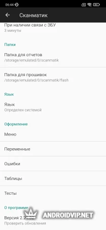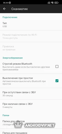 В настройках самого приложения можно выбрать: способ подключения, просмотреть привязанные устройства, активировать режим энергосбережения, выбирать папки для сохранения отчетов и прошивок, а также настраивать внешний вид интерфейса утилиты.