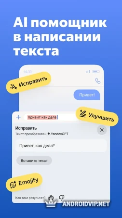 Яндекс Клавиатура с YandexGPT - отличная клавиатура для мобильных устройств с технологией YandexGPT для удобного общения и поиска информации. Программа позволит быстро, удобно и комфортно набирать текст на нескольких языках, используя все доступные способы ввода. Благодаря встроенному переводчику вы сможете беспроблемно общаться с иностранцами, а гифки, эмодзи и стикеры сделают этот процесс более увлекательным и ярким. Собственную индивидуальность можно выразить при помощи встроенных обоев и тем, а также дополнительных элементов кастомизации клавиатуры.