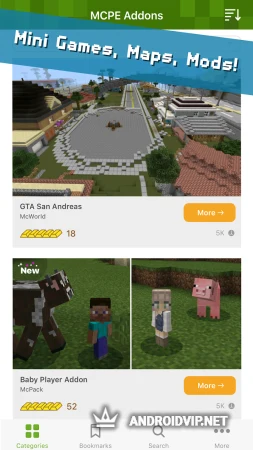 В главном меню отображаются все доступные аддоны, которые отсортированы по популярности, автору и дате добавления. Каждый аддон можно просмотреть, узнать, что именно вы получите в случае его загрузки и применения, а также сможете поделиться им с друзьями и оставить небольшой отзыв (оценку). Для установки аддона потребуется оригинальная версия Майнкрафта, после чего в одно нажатие происходит применение всех необходимых параметров и автоматический выбор дополнения.