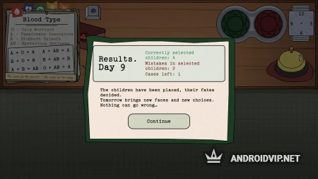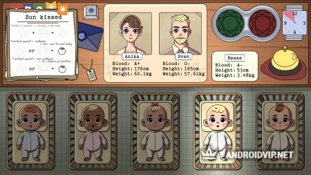 Игрок работает в родильном отделении. В вашем распоряжении окажутся карточки как младенцев, так и их родителей. Необходимо сравнивать цвет глаз, группу крови и прочие генетические признаки сходства, решая упрощенные головоломки. За успешно выполненную работу вы будете получать деньги, а за ошибки штрафы. Денежные средства вам понадобятся для оплаты аренды жилья и приобретение еды.