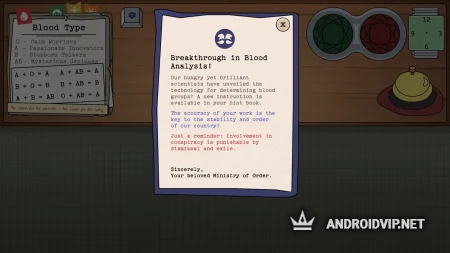 Вас ждет увлекательная история, в которой ваши коллеги будут рассказывать самые разные случаи из жизни, делиться информацией и просто общаться друг с другом. Диалоги получились насыщенными, они позволяют узнавать много нового, заводить друзей, ссориться и даже строить отношения. Вам нужно подбирать слова с осторожностью, так как среди коллег могут скрываться агенты государства, проверяющие вашу работу.