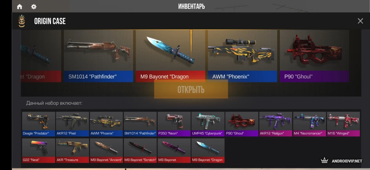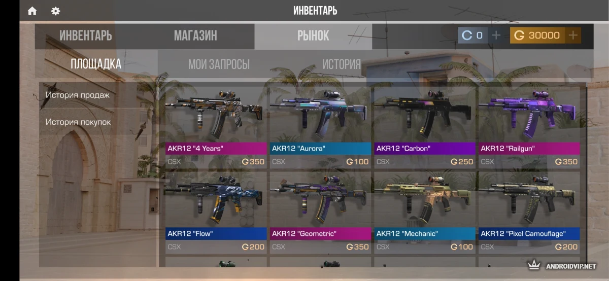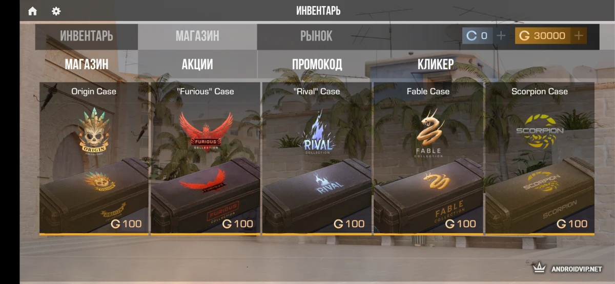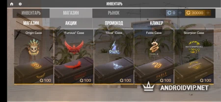 Магазин включает в себя как обычные наборы кейсов, так и приуроченные к тем или иным игровым событиям. За золото можно приобретать товары по акциям, кейсы, а также нужные вам скины на офлайн рынке. Да, рынок не онлайн, поэтому торговать с другими игроками не получится, можно лишь выкупить готовые слоты по установленным заранее ценам. В инвентаре все доступное оружие можно осмотреть, выбрать скины или же продать, в случае с копиями.