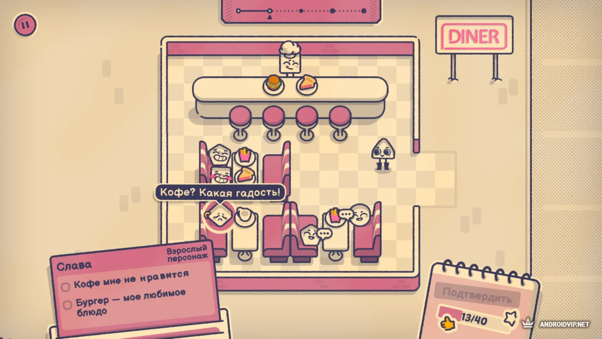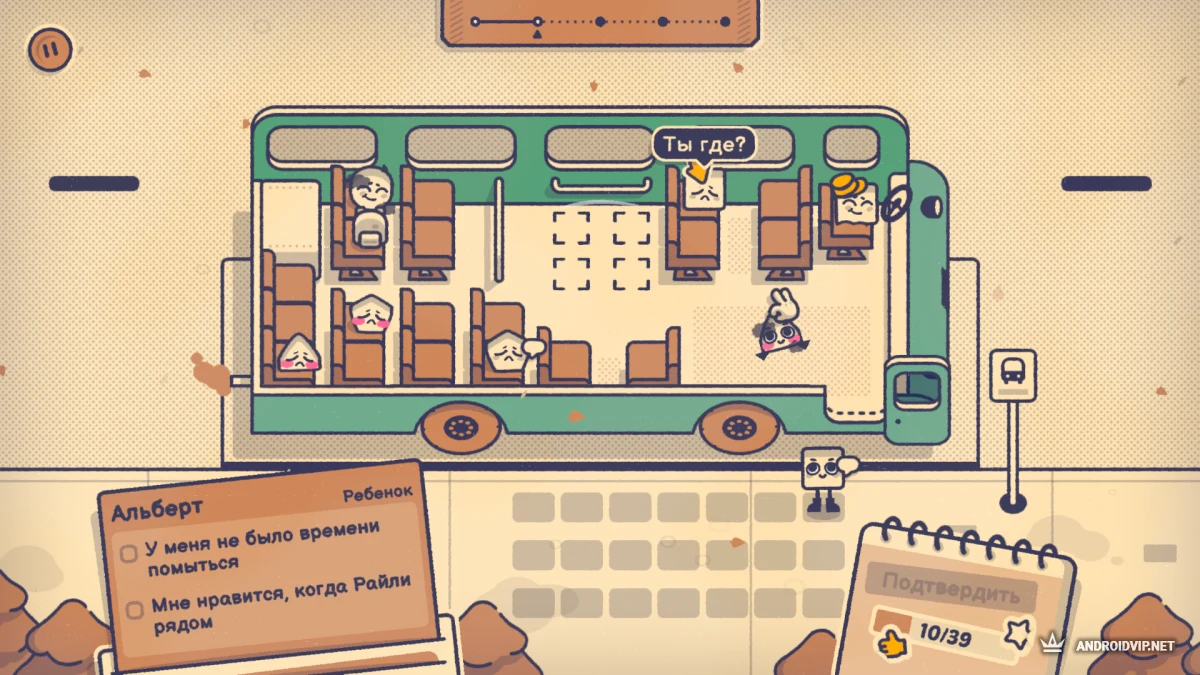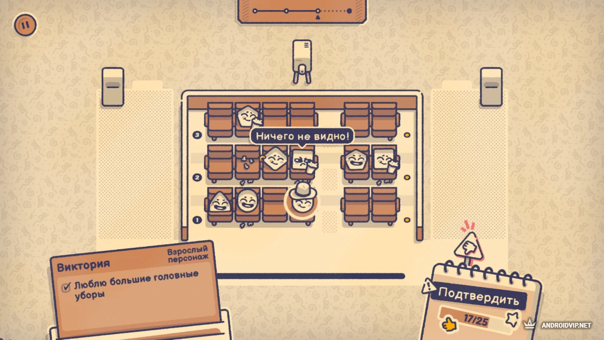 Одни герои хотят сидеть у окна, другие вдали от шумных соседей, а последние не выносят посторонние запахи. В качестве локаций выступают совершенно разные места, например такси, автобус, кинотеатр и прочие сцены, где пространство и расположение имеют огромное значение. Каждый персонаж выдвигает собственные условия, и ваша задача – расположить их так, чтобы удовлетворить их требования.