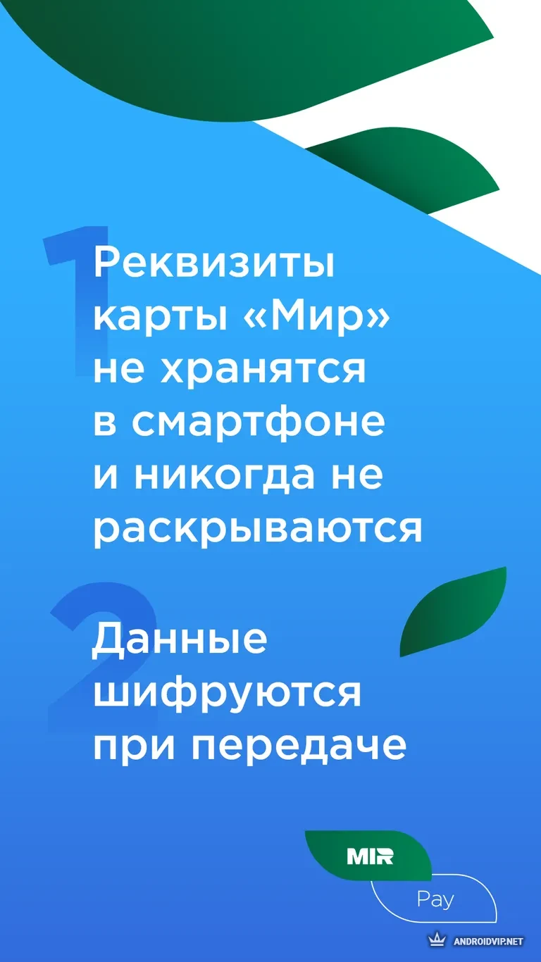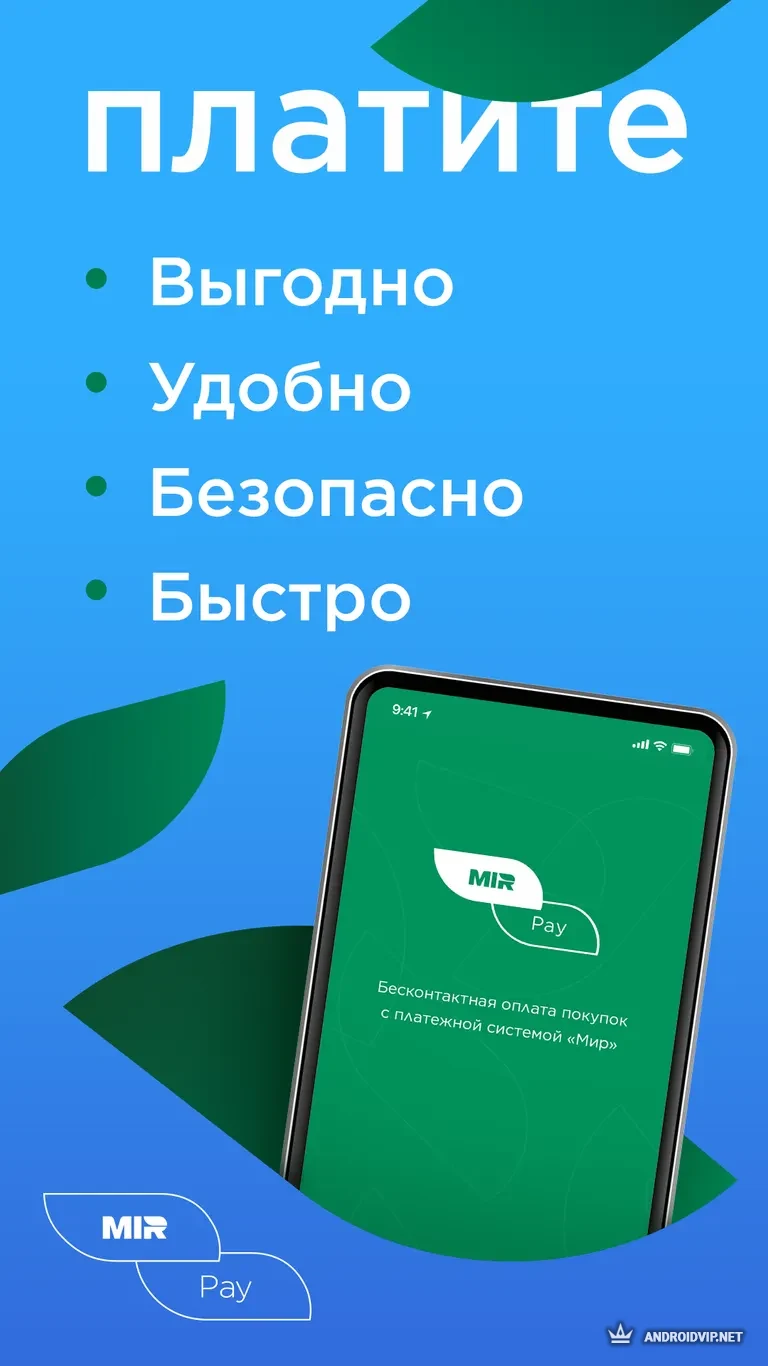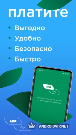 Mir Pay - официальный мобильный клиент национальной платежной системы Мир. Она позволяет бесконтактно оплачивать покупки со смартфона, используя NFC и карты с системой Мир.
