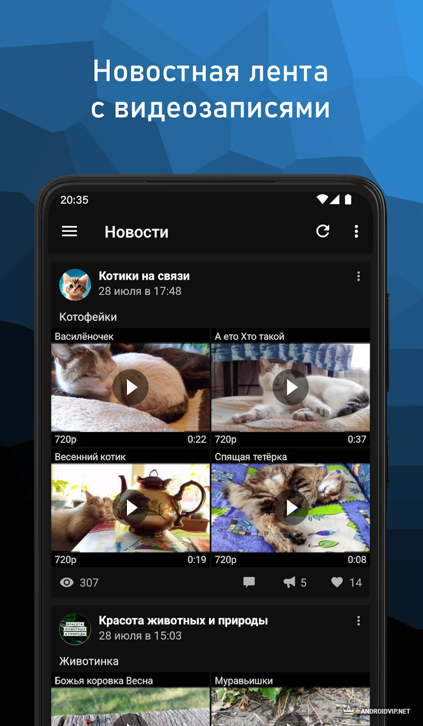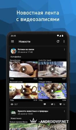Для использования всех возможностей приложения необходимо авторизоваться с помощью аккаунта одноименной социальной сети. После чего вам будет доступна новостная лента со всеми видео, размещенных в сообществах, на которые вы подписаны. Каждое видео можно просмотреть и поделиться ими с друзьями, оставить комментарий и поставить лайк.