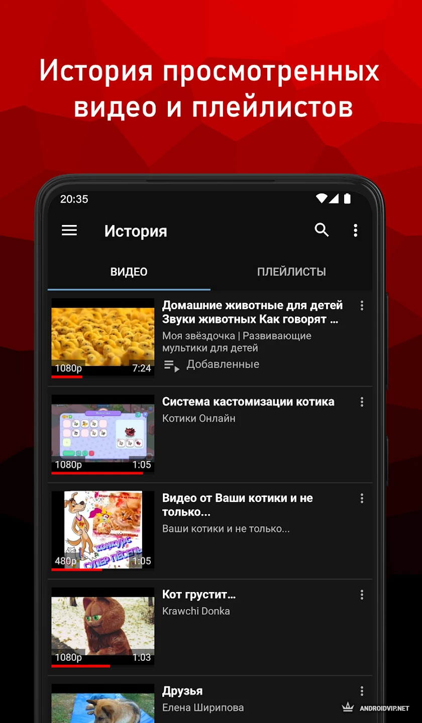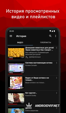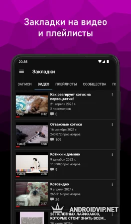 Просматривать можно не только видео из сообществ, но и ваших друзей (видео должны быть открыты). Для удобства в приложении можно воспользоваться поиском по сообществам и видео в них. Можно создавать плейлисты и добавлять видео в закладки, просматривать историю и открывать ролики в сторонних плеерах (при необходимости).