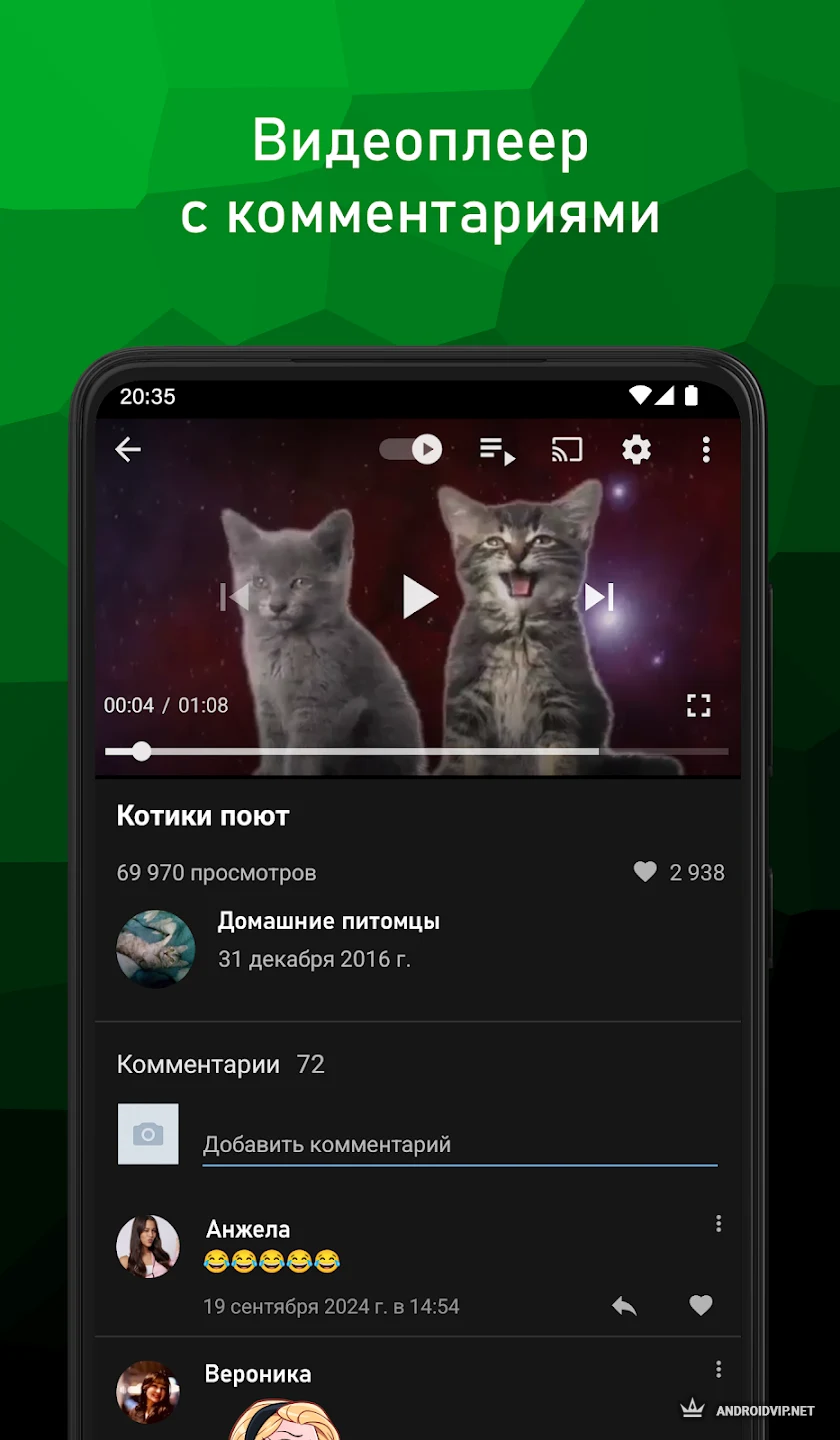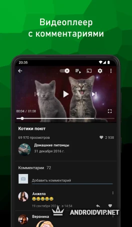 Программа будет интересна тем, кто пользуется DLNA/Chromecast, ведь с помощью данной технологии можно просматривать видео на ТВ. Все видео можно скачивать в память устройства, публиковать их на свою страницу и просто комментировать. В настройках можно выбрать темную тему и включить PIN-код на вход в приложение.