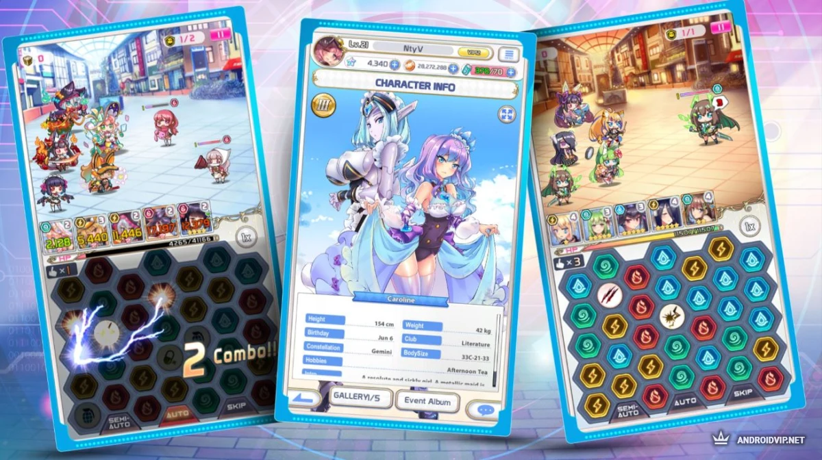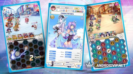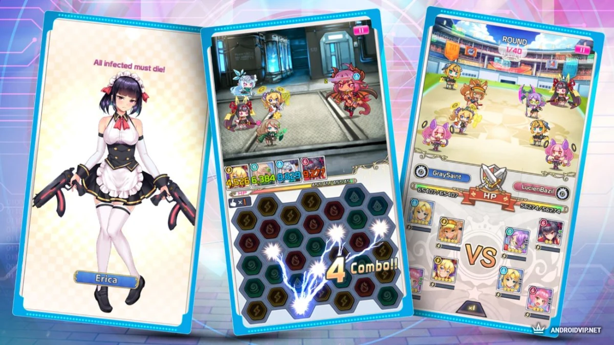 - Головоломки в бою (Puzzle-RPG): Сражения проходят в формате "три в ряд" (match-3). Выстраивая комбинации из специальных камней на поле, вы активируете атаки своих героинь. От стратегии сборки команды и тактики на игровом поле зависит исход битвы.