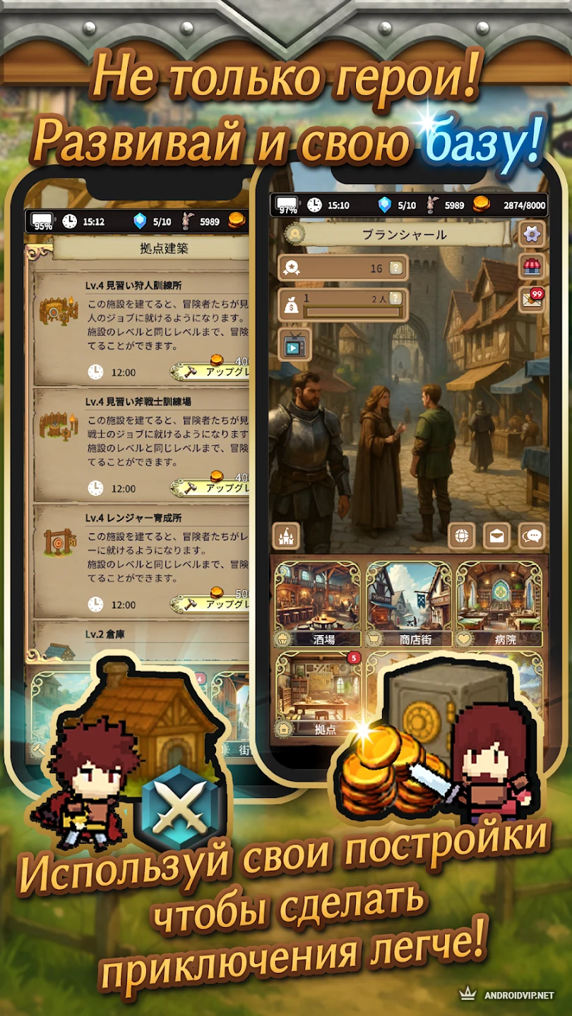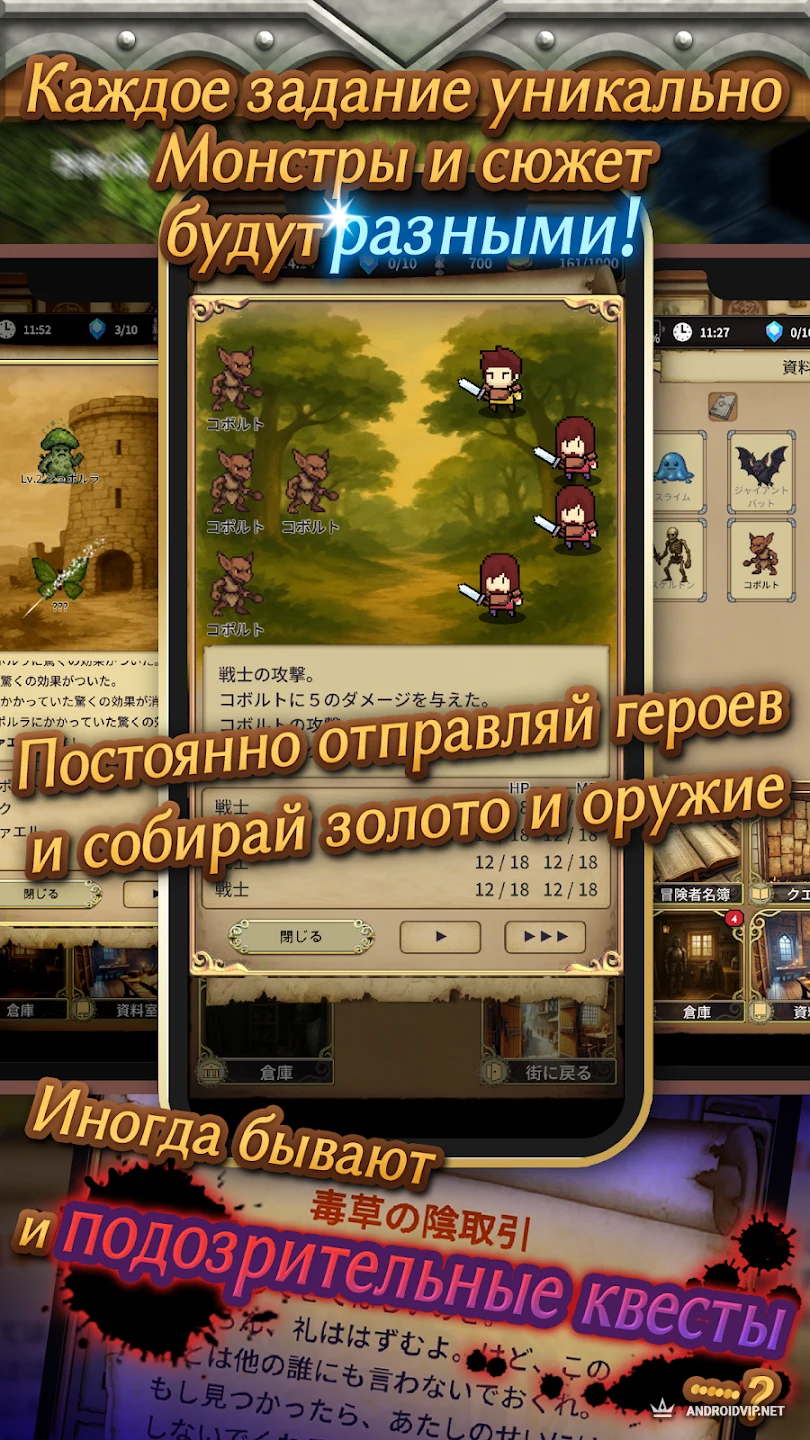 Вы нанимаете приключенцев с разными профессиями (воин, маг, лекарь) и характерами, формируете из них группы и отправляете выполнять задания в открываемые вами регионы. Улучшаете здания в деревне (жильё, кузницу, магазин), что повышает эффективность приключенцев и увеличивает доход. Задания выполняются автоматически в реальном времени, даже когда игра закрыта. Вы возвращаетесь, чтобы собрать награды, прочитать отчёты о приключениях и выдать новые задания. Все события — победы, потери, находки — записываются в хронику, которая становится вашей личной историей этого мира.