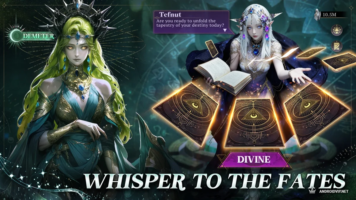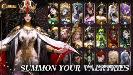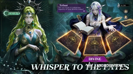 Призыв богинь — главная механика. Вам гарантированно дают могущественного героя Арьес сразу при старте, плюс 10 перьев призыва богов для теста удачи. За выполнение заданий можно получать новых персонажей бесплатно.