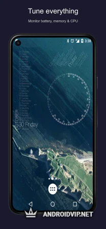 Мониторинг системы: батарея, память, процессор, местоположение, трафик.