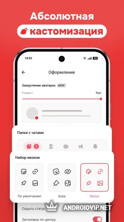 Приложение построено на современном дизайне, который сочетает Telegram Design System, Google Material 3 и авторские иконки. Для Android 12 и выше работает поддержка динамических тем Monet — цвета интерфейса подстраиваются под обои. Есть расширенные настройки интерфейса.