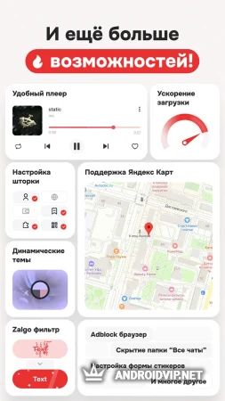 - Встроенный браузер с AdBlock и Яндекс.Карты.