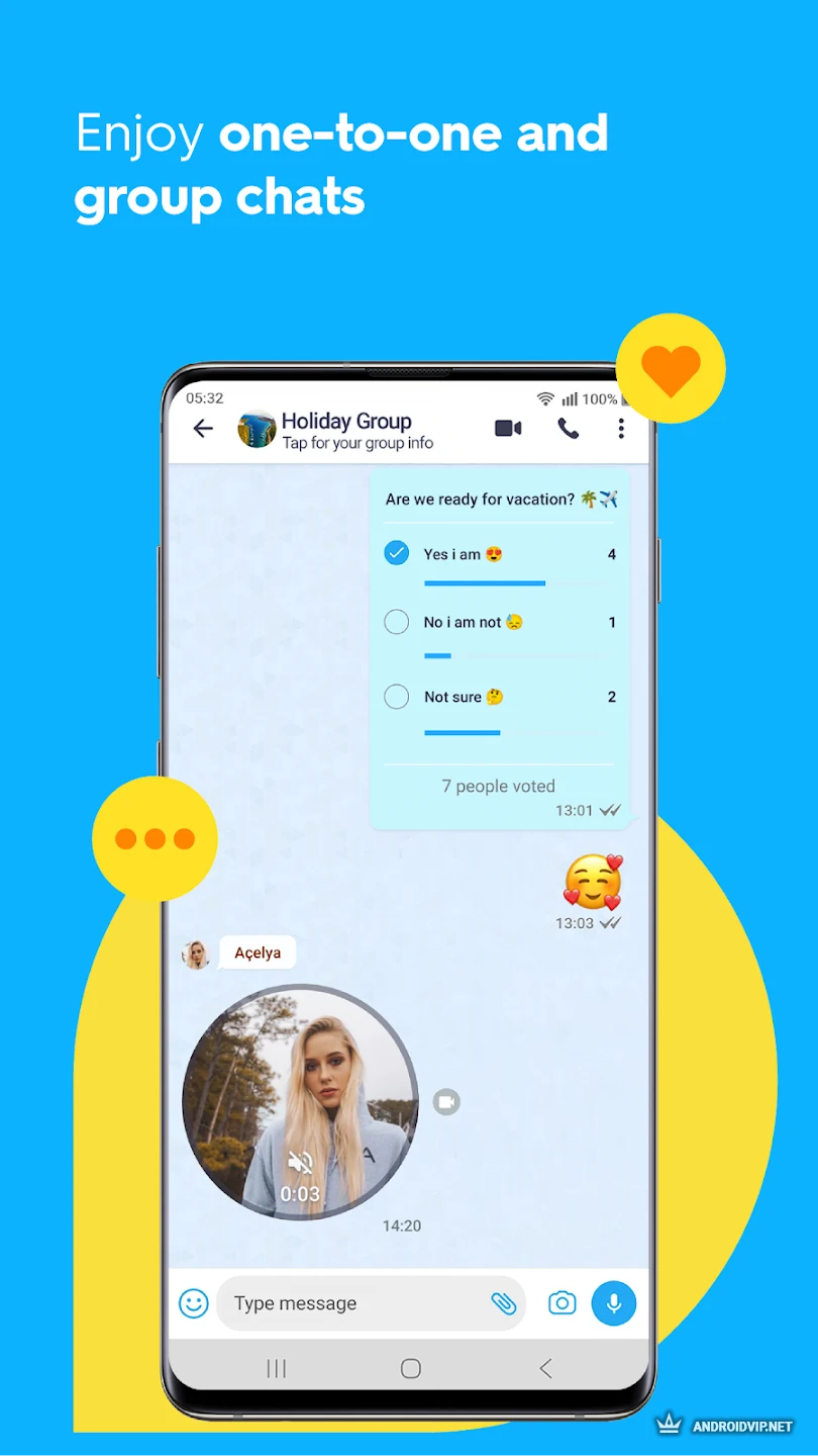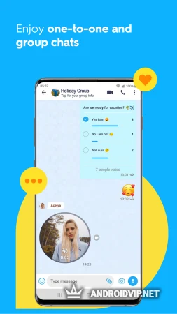 - Групповые чаты: можно собираться с друзьями, семьёй или сообществами, создавать опросы.