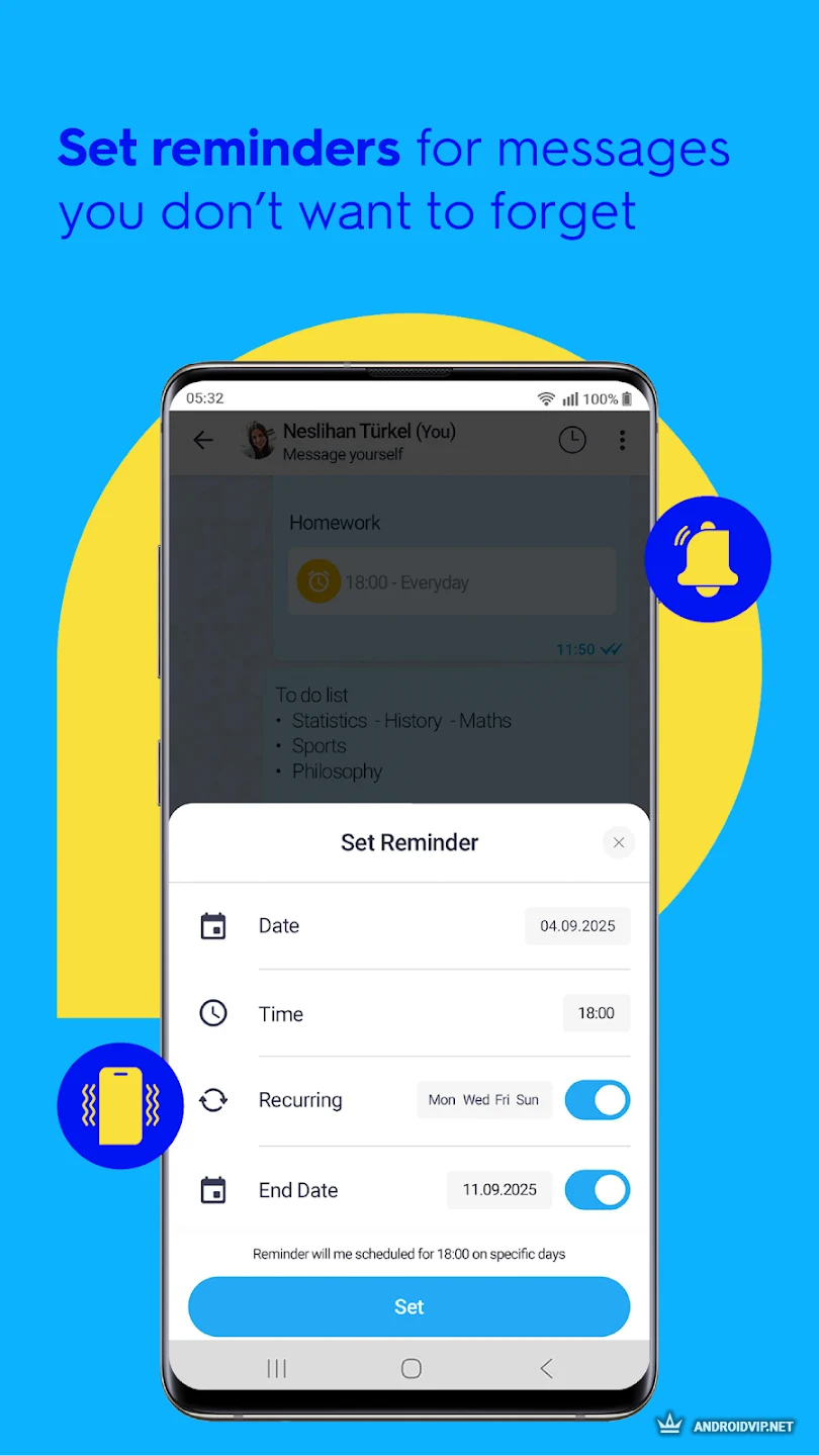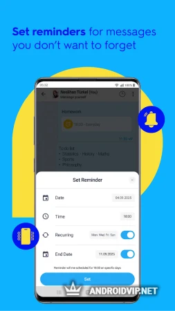 - Напоминания: отправляешь себе сообщение и ставишь напоминание — BiP дёрнет в нужное время.