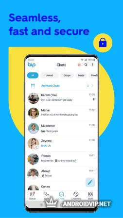 - Безопасное общение: все чаты и звонки зашифрованы, данные не сохраняются и не передаются третьим лицам. Ни BiP, ни кто-то другой не может получить доступ к вашим перепискам.
