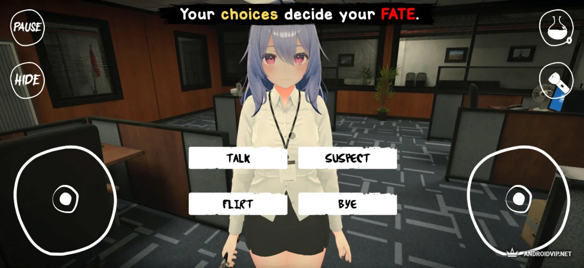 Вы задержались на работе, закрывая важный дедлайн. Мира, ваша ассистентка, ведёт себя странно: слишком близко, слишком одержимо. В какой-то момент вы находите мёртвое тело своей школьной подруги Клары-тян в офисе. С этого момента офис превращается в ловушку. Кто-то смотрит из окна, следует за вами до дома, шепчет из тени. Мира — просто безумная влюблённая девчонка? Или нечто гораздо более зловещее, скрывающееся за парой милых аниме-глаз? Вам предстоит раскрыть её тайну, прежде чем её любовь убьёт вас.
