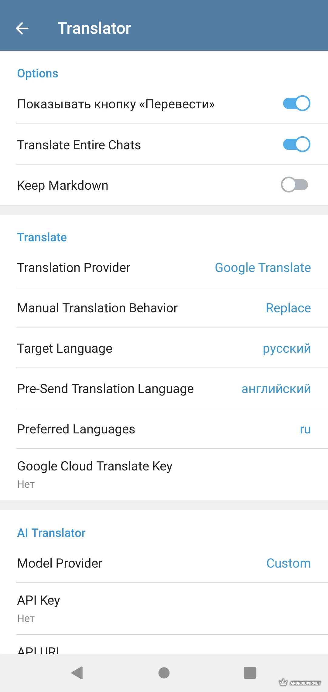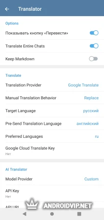 - Перевод целых чатов (Microsoft Translator или ИИ) и отдельные сообщения