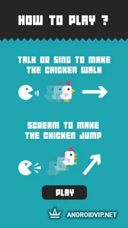 Chicken Scream - забавная игра, в которой вы будете управлять курицей. Но управлять не с помощью пальцев, а голосом! Так, например, с помощью разговора или пения курица будет перемешаться вперёд,, а чтобы она совершила прыжок, нужно закричать. Уровни состоят из островков, поэтому необходимо держать свой голос под контролем, чтобы не дать курочке упасть в воду, иначе игра подойдет к концу и вы начнёте сначала.