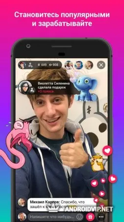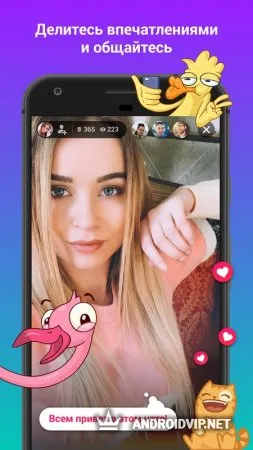 Во время показа видео пользователь может воспользоваться чатом и поддерживать общение с другими людьми, а также отправлять платные и бесплатные подарки друг другу, стикеры. Так что если вам очень нравится какой-либо ваш кумир, то вы всегда сможете поддержать его приятным подарком. На главной странице вы сможете самостоятельно выбрать ту или иную трансляцию.