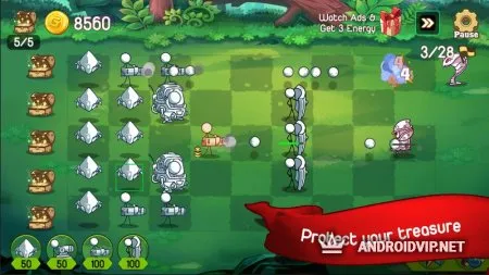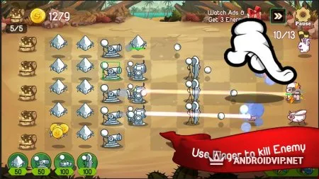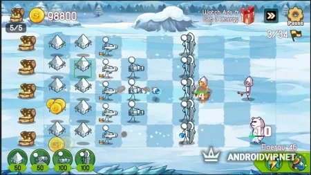Игровой процесс проходит следующим образом: на первой линии необходимо выстроить элементы, которые будут добывать специальные ресурсы и элементы. На второй – элементы защиты и своих подопечных. Все остальное построено на основе кликера. Если вдруг в какой-то части обороны пропал боец с пушкой, ничего страшного, начните тапать по врагу, который решил воспользоваться этой слабостью, и вы расправитесь с ним, даже не используя никакого вооружения.