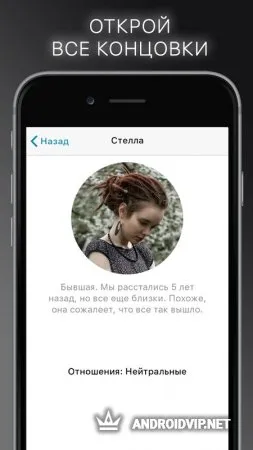 Изучайте героев и их характеры, проблемы, секреты. Пройдите интересные задания чтобы узнать, что же лежит в основе этой кровавой истории, и ждет ли персонажа счастливый конец. В зависимости от того, какой шаг вы предпримите, будут складываться ваши взаимоотношения с другими персонажами.