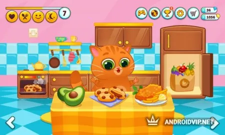 Приготовление вкусных лакомств для питомца проходит на кухне. Еду можно покупать в игровом магазине или готовить самостоятельно. Набор продуктов для кота, честно говоря, странный. Котик будет питаться бананами, хлебом, шпинатом, листьями салата, гамбургерами, запивать сладости чаем или кофе. Кормить кота нужно вовремя, чтобы не питомец не заболел.