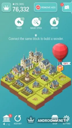 Насладитесь простым, но очень увлекательным игровым процессом. Достаточно провести по блокам пальцем, чтобы создать из них улучшение для вашего строения. В каждой эпохе есть свои особенности, создайте уникальное чудо света, чтобы в сразу возвысить свою цивилизацию. Благодаря такому разнообразию, вы можете начать свои приключения с каменного века и закончить его на освоении космоса.