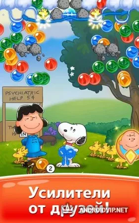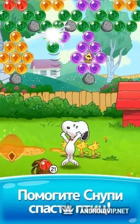 Bubble Shooter - Snoopy POP! - яркая игрушка по мотивам популярных комиксов "Мелочь пузатая" в которой вы вместе с собакой Снупи, Чарли Брауном и другими персонажами будете лопать разноцветные шары! Птичка Вудсток попала в беду и не может выбраться из ловушки с пузырями! Вы должны придумать план, чтобы освободить её оттуда, а также нейтрализовать главного злодея, который всё это устроил - Красного Барона!
