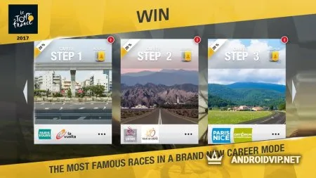 Tour de France - Cycling stars Official game 2017 - официальная игра на основе самого престижного турнира по велогонкам. В игре у вас есть возможность попробовать себя в роли тренера профессиональной команды велогонщиков и вывести их на Тур де Франс, с его знаменитыми трассами. Разработайте свою стратегию успеха, анализируйте преимущества и недостатки каждого участника. Улучшайте велосипеды, приобретая новые детали к ним. Выигрывайте ценные призы в режиме карьеры и эпичных противостояниях с такими же игроками как и вы. Для игры рекомендуется аппарат с минимум 1.5 гигабайтами оперативной памяти на борту.