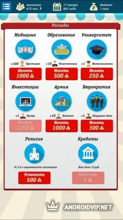 Симулятор России - именно так, в вашем распоряжении окажется наша огромная страна, начиная аж с 862 года. Берите полный контроль над государством и контролируйте его во всех отраслях: политики, торговли, в сфере налогов, и так далее. Не менее важно будет отстаивать свою территорию в военных битвах. Окунитесь с головой в историю и пройдите сами сквозь более чем три сотни подлинных событий, играйте с друзьями, союзничайте или враждуйте, а также не упустите возможность сыграть за самых известных руководителей России.