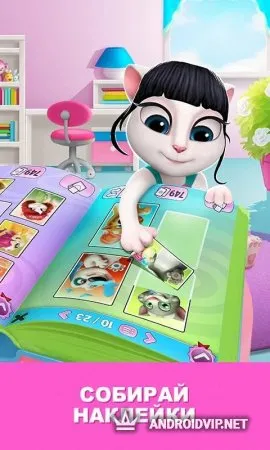 С каждым новым уровнем игроки будут отслеживать развитие котенка, получая дополнительные возможности, улучшая различные показатели своей героини. Игровой процесс включает несколько увлекательных мини-игр и викторин, за прохождение которых можно получить дополнительный опыт, приятные бонусы и игровые монетки. Игровая валюта необходима для совершения покупок в уникальном игровом магазине. Помимо этого Анджела имеет свой личный фотоальбом с крутыми наклейками, которые можно коллекционировать, продавать или обмениваться картинками со своими друзьями. Каждый новый уровень дарит игрокам новый набор наклеек.