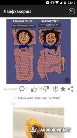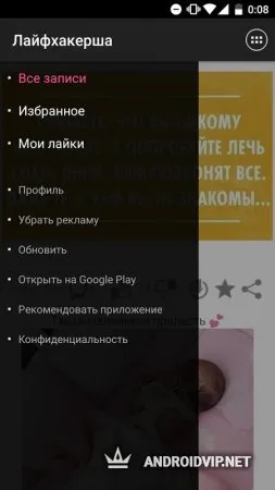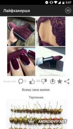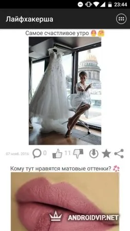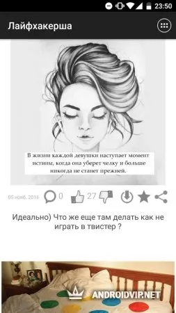Лайфхакерша - это большая коллекция "лайфхаков", полезных советов для девушек на все случаи жизни. Как правильно нанести макияж? Какие лучшие средства для укладки волос? Все эти советы должны быть в арсенале каждой уважающей себя девушки. Вы узнаете о последних модных трендах и не только. Упростите свою жизнь, следуя этим маленьким хитростям. Если какая-то запись вам пришлась по душе, можно поставить ей оценку, а также сохранять в свою коллекцию. Делитесь лайфхаками посредством соцсетей и мессенджеров.