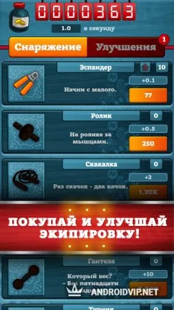 Накачай Качка - это увлекательная игра в жанре "кликер" на тему бодибилдинга, в которой у вас есть возможность пройти путь парня, который решил стать культуристом. Превратитесь из унылого дрыща в матёрого качка, с огромными бицепсами, мощною грудью, и шикарным прессом. Также вы можете приобретать новые тренажёры и другие приспособления для развития телосложения главного героя. Постепенно можно будет улучшать своё жильё и приобрести абонемент в хороший тренажёрный зал. Следите за своим прогрессом и получайте разные бонусы в процессе игры.