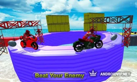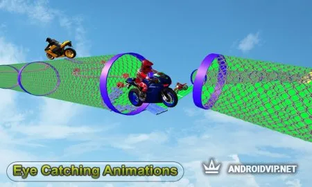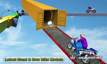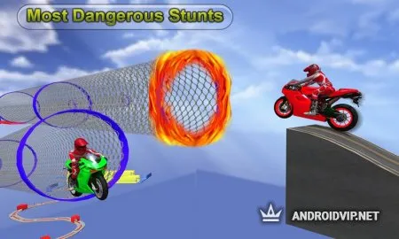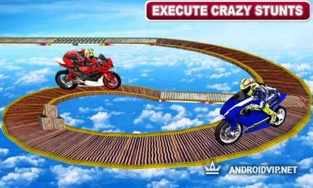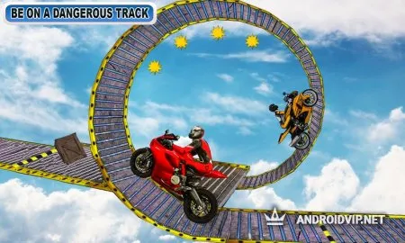Racing Moto Bike Stunt : Impossible Track Game - захватывающая игра на Android, где вы управляя мотоциклом будете кататься по невероятным трассам, находящимся в небе, причём эти трассы будут насыщены экстремальными возвышенностями, крутыми поворотами, трамплинами, огненными кольцами и другими опасными участками, при прохождении которых зашкаливает адреналин. Вас ждут различные виды мотоциклов и такие известные марки, как Honda, Suzuki и другие. Все они имеют свои характеристики и различаются внешне.